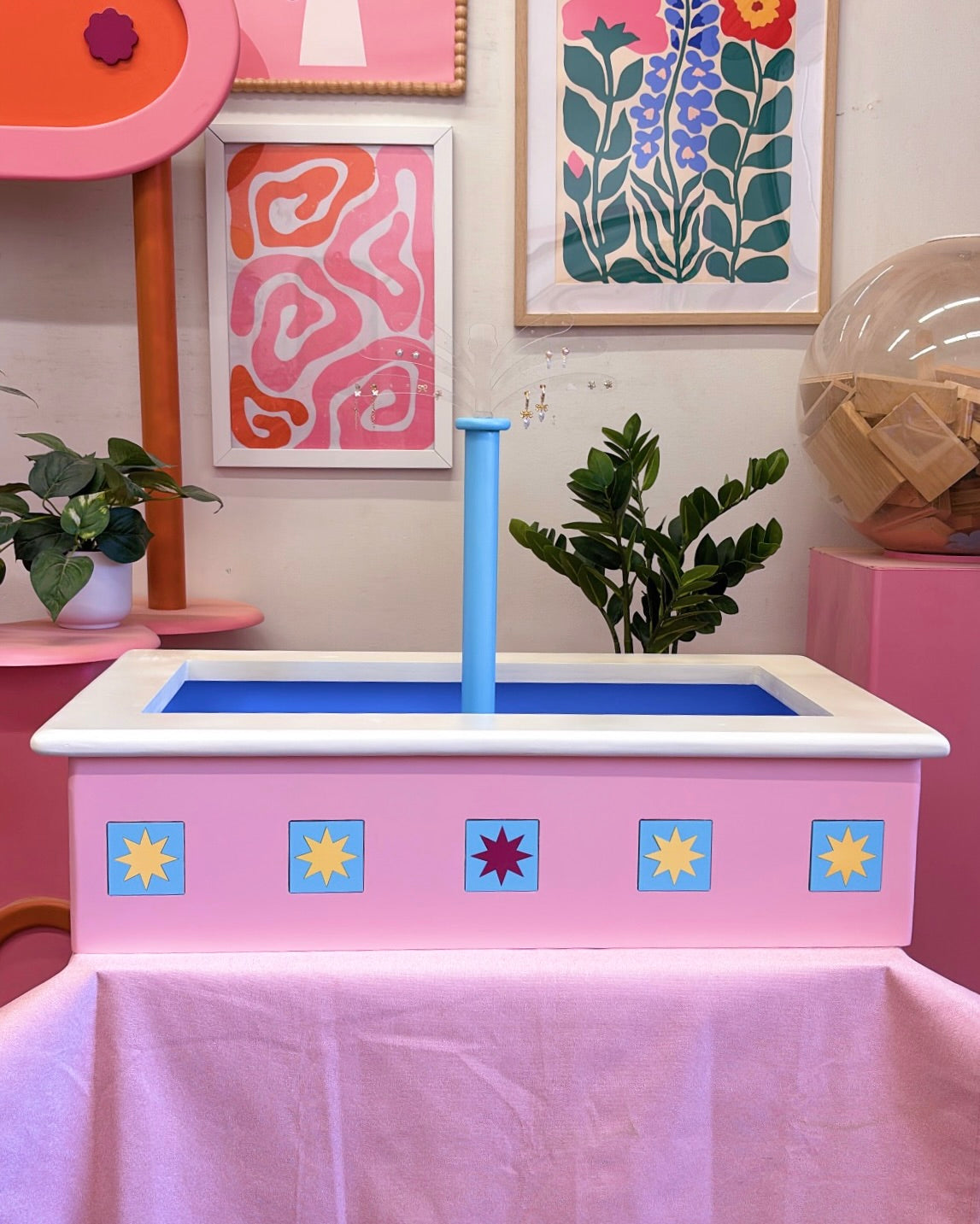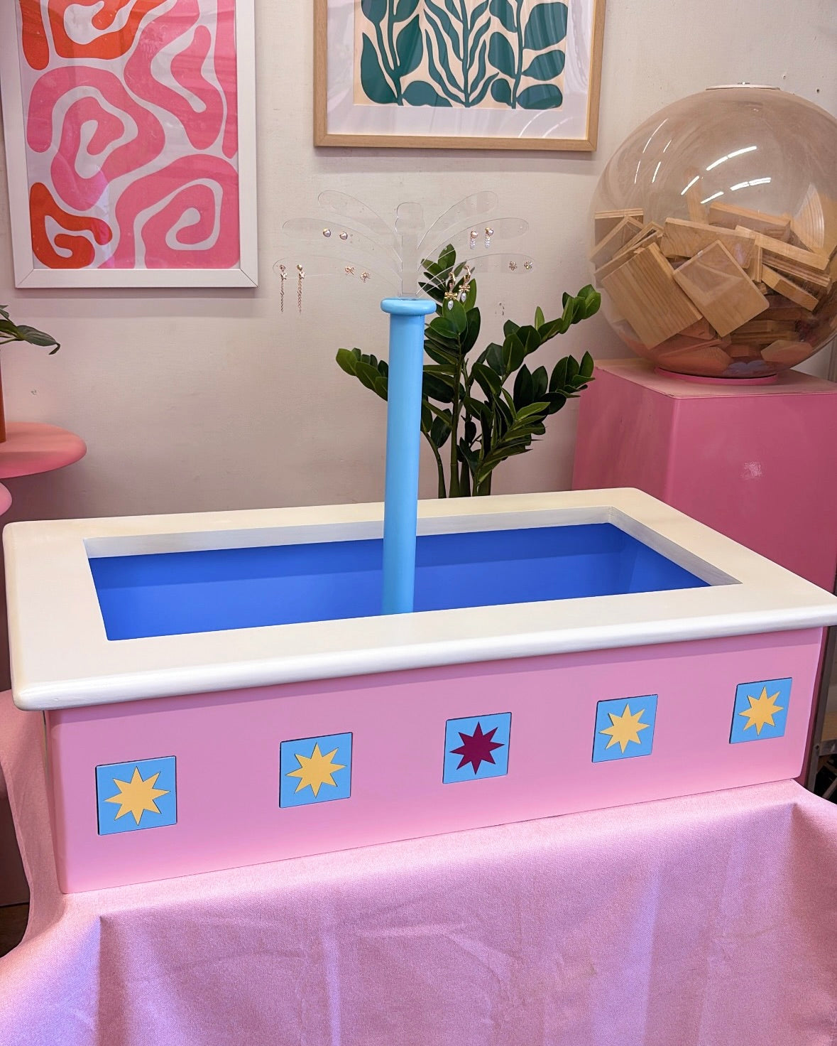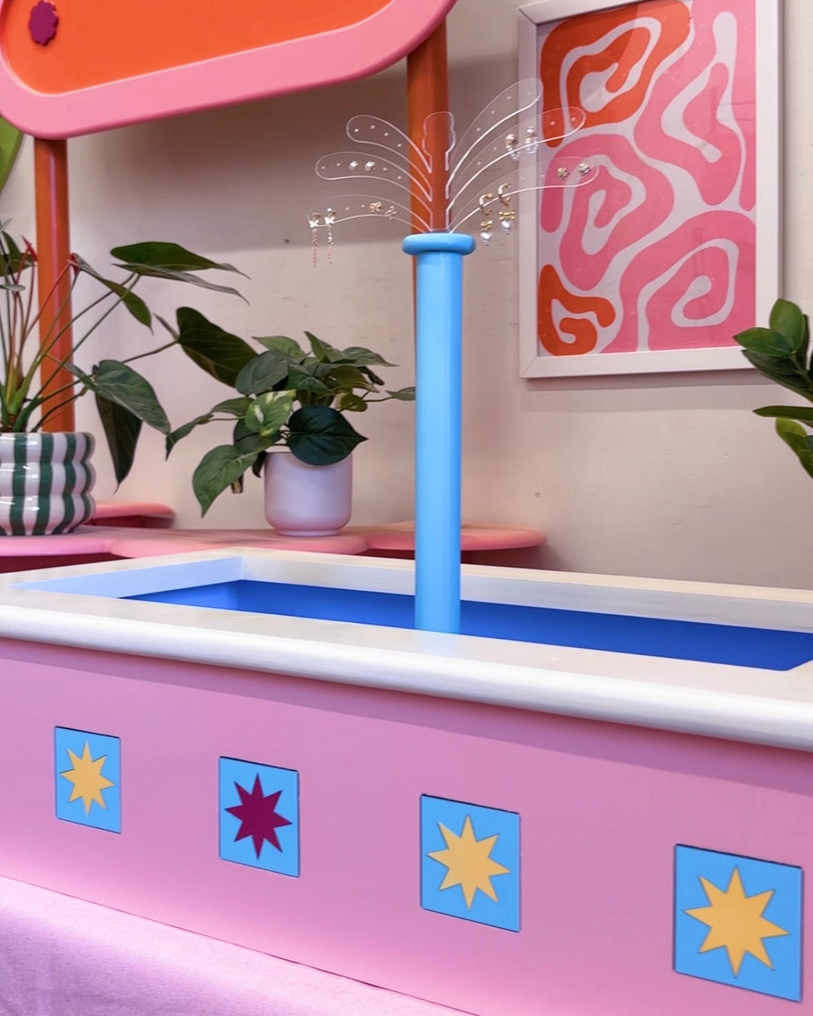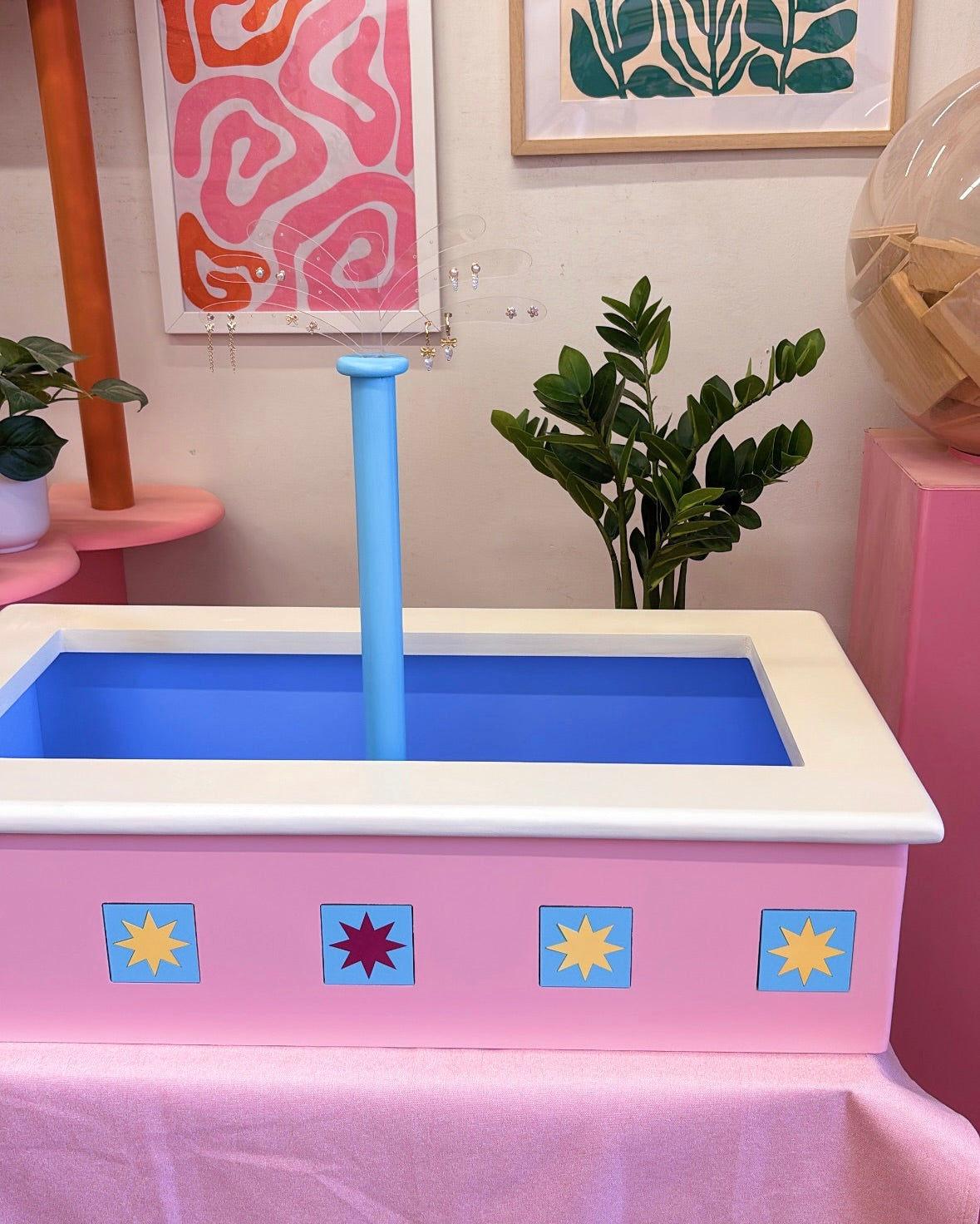 Reimagined as a functional accessory display, complete with tiled base, star detailing, sky-blue “water,” and a clear splash form designed to hold earrings mid-swish.